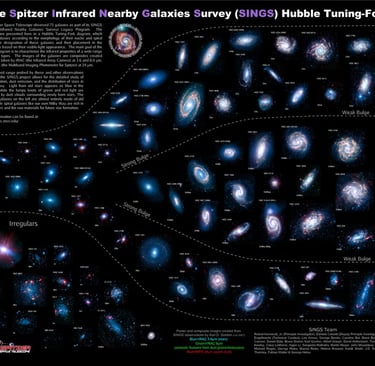 The Spitzer Infrared Nearby Galaxy Survey (SINGS) has provided significant insights into the properties of galaxies, particularly in the infrared spectrum. This survey observed 75 galaxies, meticulously chosen based on their representation in the Hubble Tuning Fork diagram. This diagram offers a unique way to categorize galaxies, serving as a historical benchmark in the astrophysics community.